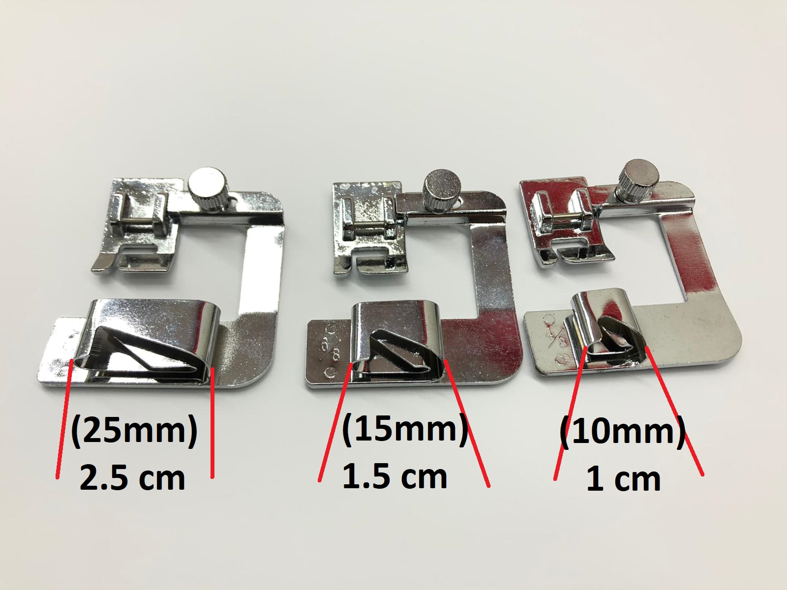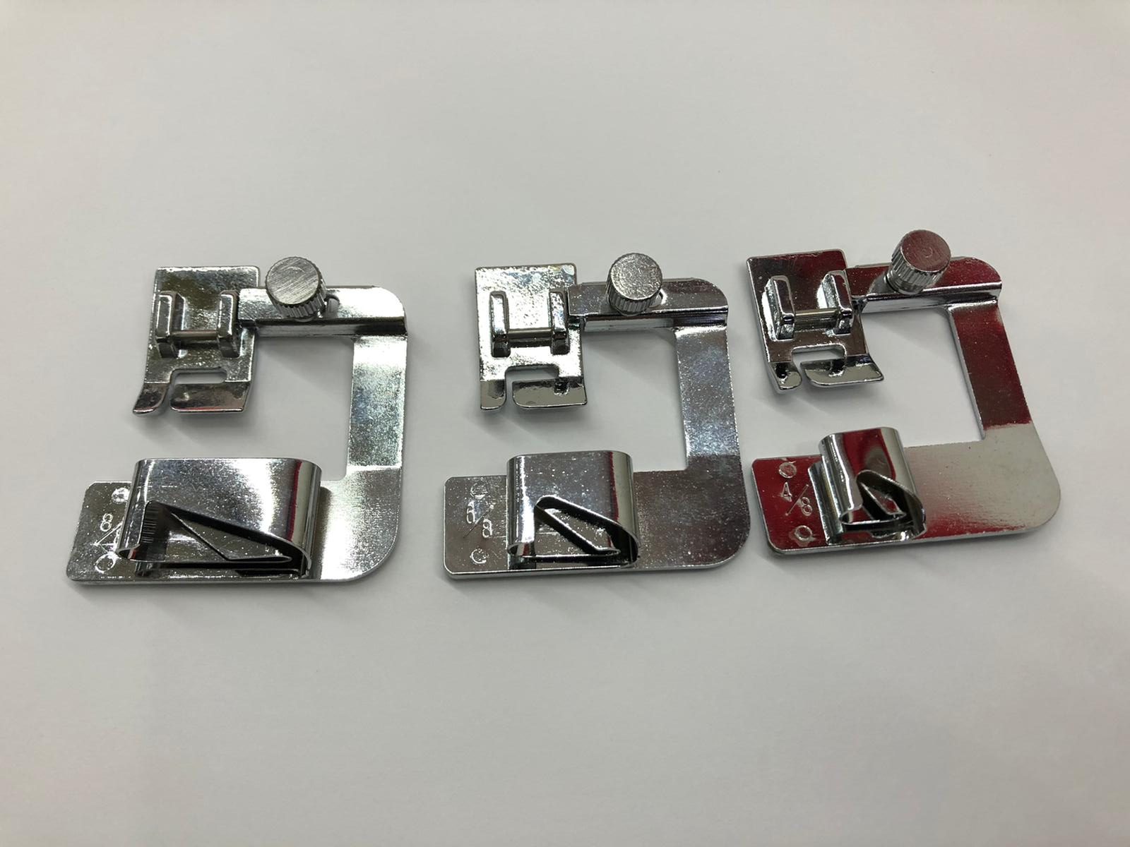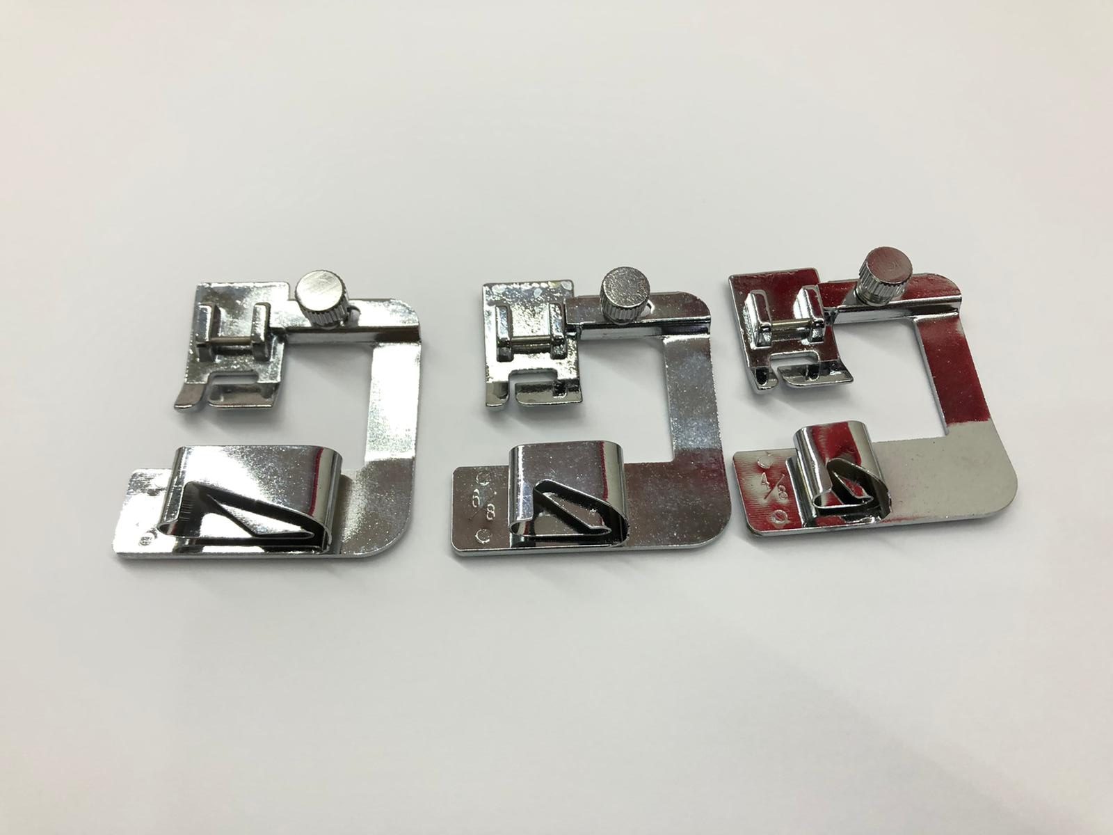 3 lü Kumaş Kenarı Kıvırma Seti 2.5cm , 1.5cm, 1 cm Geniş bölüm kıvırma ayak seti 3 lü set tek tek alımlarda adet fiyatı 60 tl ev tipi tüm tak cıkar ayak kullanan makinelere uygundur. standart tutucu kullanan makinelerde geniş alanlarda kıvırma yapılmasında kolaylık sağlamaktadır.