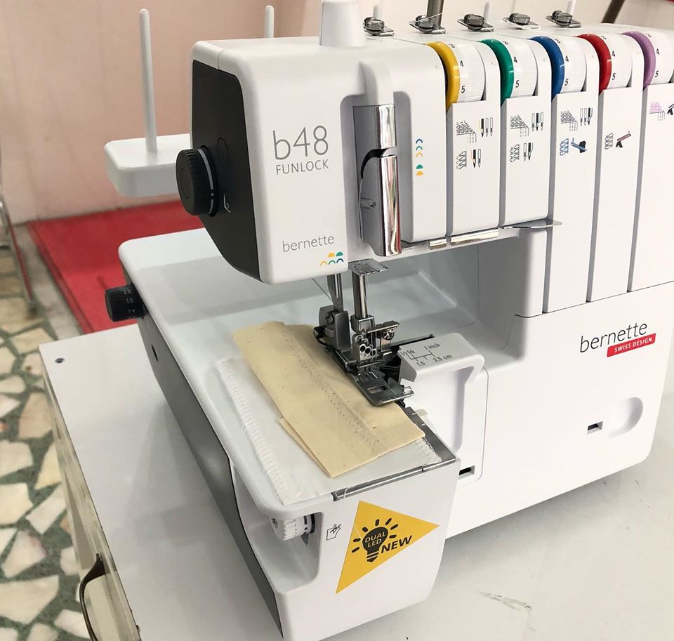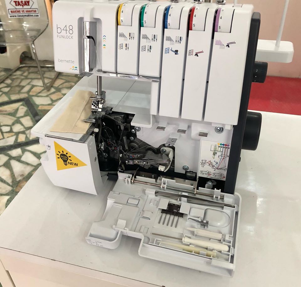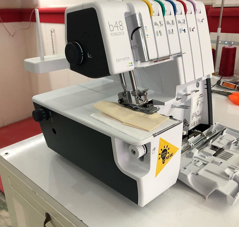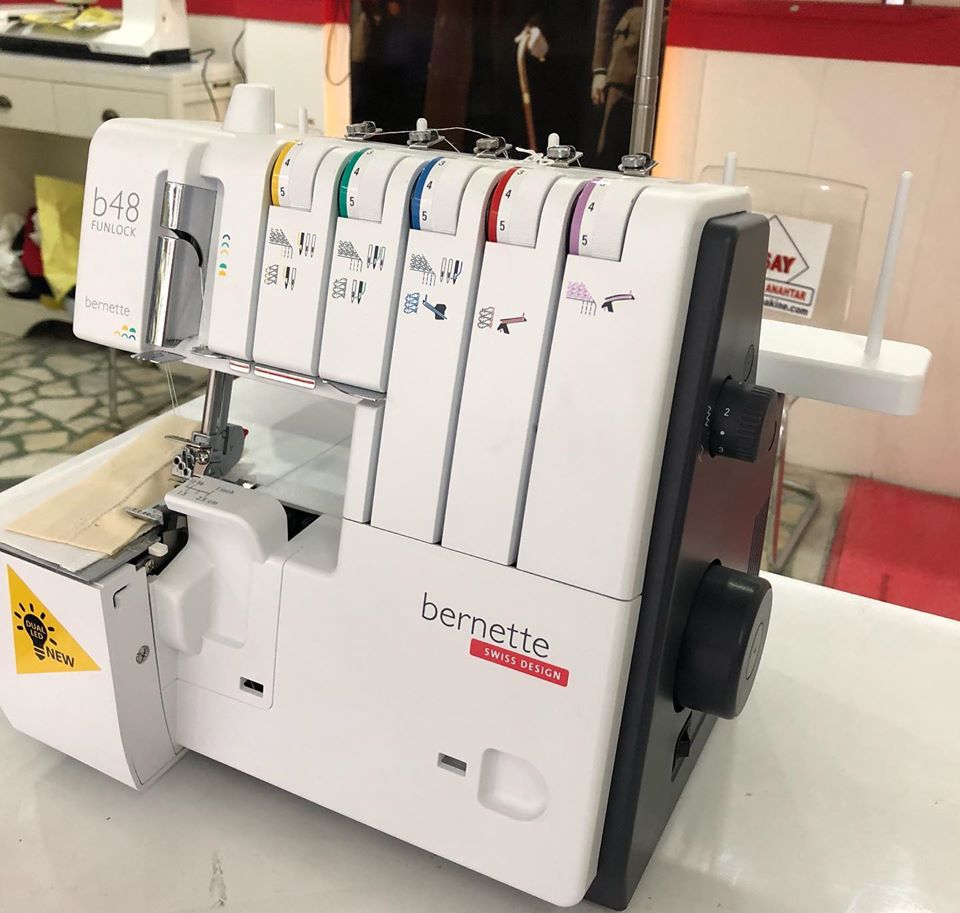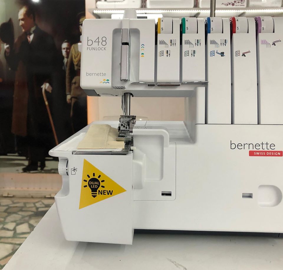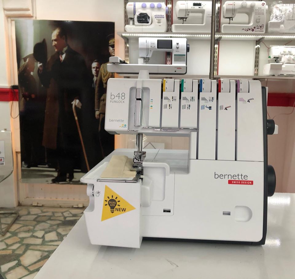 (975 FRANK FİYATI) KURA GÖRE DEĞİŞİR Yetkili Bayii den sıfır ürün Bernina Bernette B48 Reçme ve Overlok Coverlock kaliteli daha iyisi yok Funlock serisinin yıldızıdır ve bir overlok makinesi ile bir reçme makinesinin kombinasyonudur. 23 dikişe sahiptir: 15 overlok dikiş, 3 reçme dikiş, 4 kombinasyon dikiş ve 1 zincir dikiş; overlok dikişler, 7mm’ye varan bir dikiş genişliğine; reçme dikişler 2.8 veya 5.6 mm dikiş genişliklerine ve kombinasyon dikişler ise 10 mm’ye varan bir dikiş genişliğine sahiptirler. Renk kodlu iplik yolları, iplik geçirilmesini kolaylaştırmakta ve iğne alanında bir manüel iplik geçirici iğnelere iplik geçirilmesine yardımcı olmaktadır. Daha alçak ilmek yapıcı ve zincir ilmek yapıcı bir mekanik iplik geçiriciye sahiptirler. Bıçak alttan çalıştığından sadece temiz kesilmiş bir kenar sağlamakla kalmaz, aynı zamanda kullanımı güvenlidir ve tek elle rahatça ayarlanabilir. Parlak LED ışığı, iyi aydınlatılan dikiş ve iplik geçirme alanına sahiptir. bernette Funlock 48, dakikada 1300 dikişe varan bir dikiş hızına sahiptir.