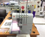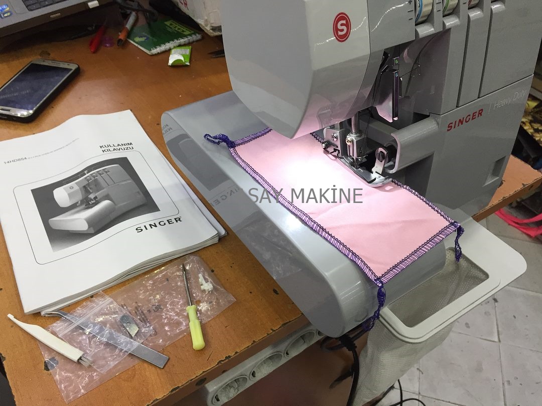 Singer 14HD854 overlok makinesi kutusunda kullanım kılavuzu köpükleri fire kabı sıfır ayarında temiz bakımları yapılmış singer 3 4 iplik overlok serbest kol paça dikişi renkli iplik yolları seri ve sessiz çalışma esnek kumaşlar da dikiş imkanı büzgü ayarı adım ayarı tülbent ince kumaş dikme olanağı masa üstü vakumlu ayaklar singer kalitesi üst sekment tarafımızdan 1 yıl garantili taşay makine güvencesi ile