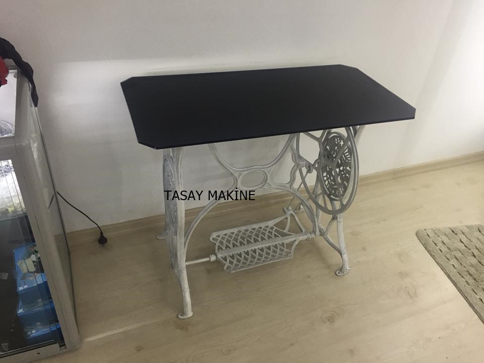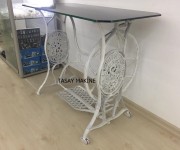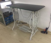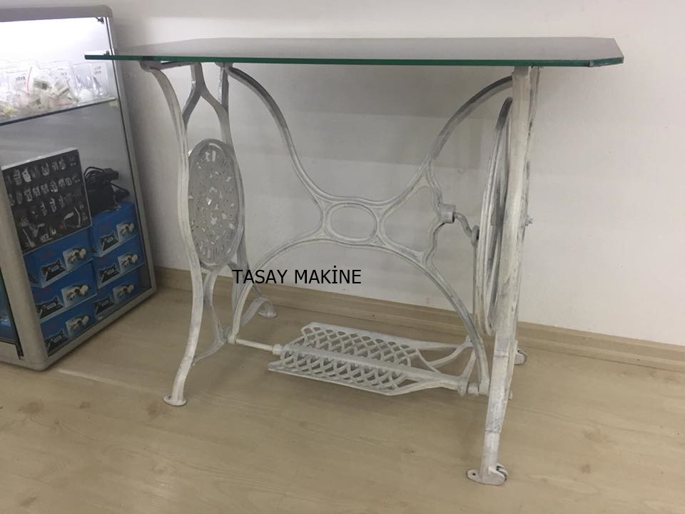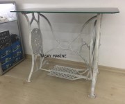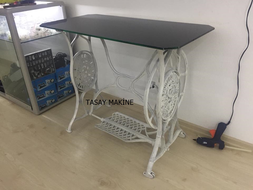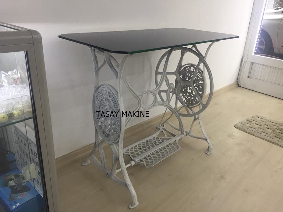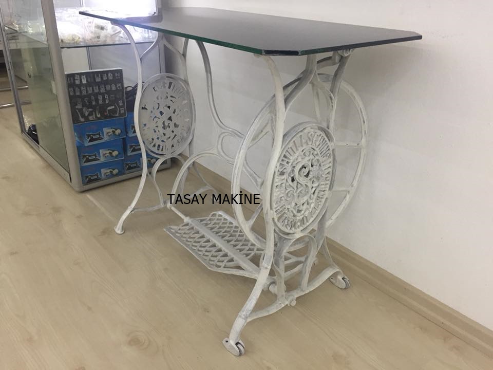 Singer Antika Dikiş Makinesi Sehpa Beyaz cam masa sehpa tv ünitesi bahçe mobilyası olarak kullanılabilir. 1925 model antika singer ayak beyaza boyanmış cam ile şık bir dekorasyon ürününe çevrilmiştir.